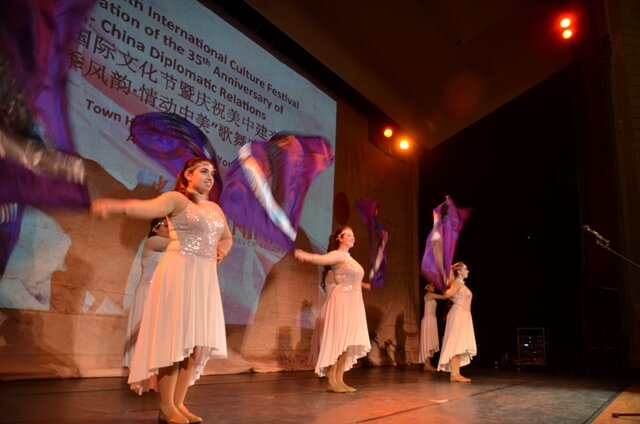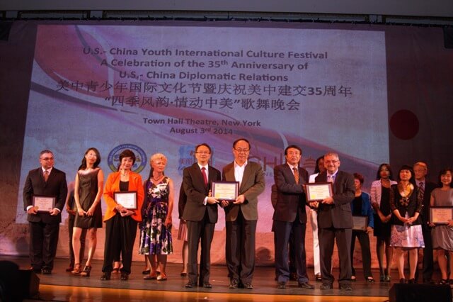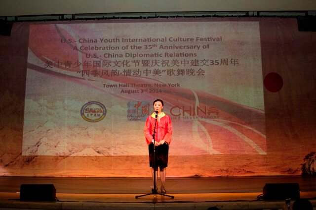 On August 3, 2014, the 35th anniversary of the establishment of U.S.-China diplomatic was celebrated at the event “An Evening of Chinese Culture.” The evening celebrations included song and dance performances as part of the 2014 “U.S. China Youth International Culture Festival” in Broadway’s renown Town Hall. The event was an opportunity for New Yorkers to gain a deeper understanding and appreciation of Sino-American cultural and artistic exchange, the result of united sponsorships by Sino-American Culture and Arts Foundation, and the Cimagine Media Group. Performances of Chinese operatic ballets were held, alongside a sumptuous banquet for especially invited honoured guests.