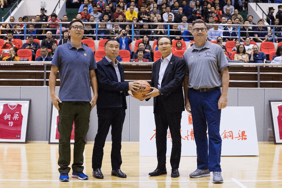 美国球队教练与美中文化艺术基金会张锦平会长将美方全体球员签名的篮球赠与铜梁政府