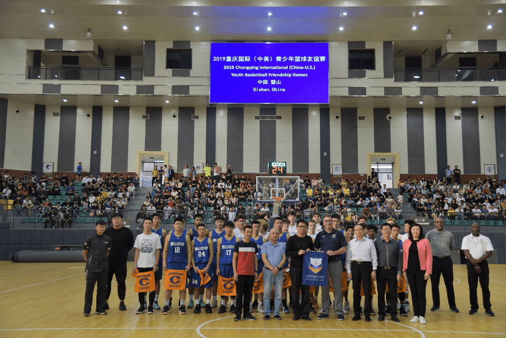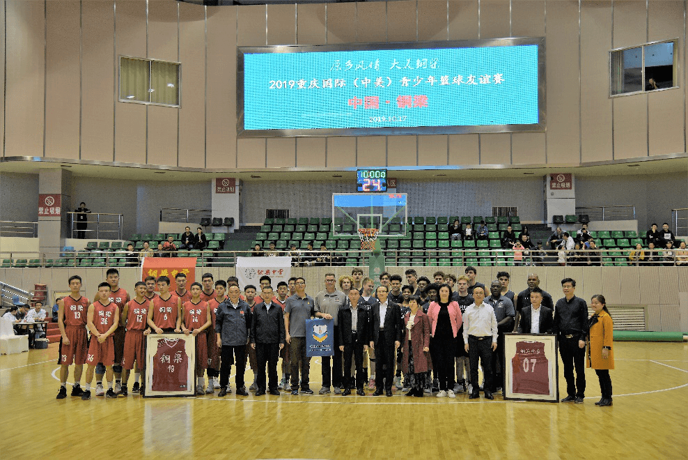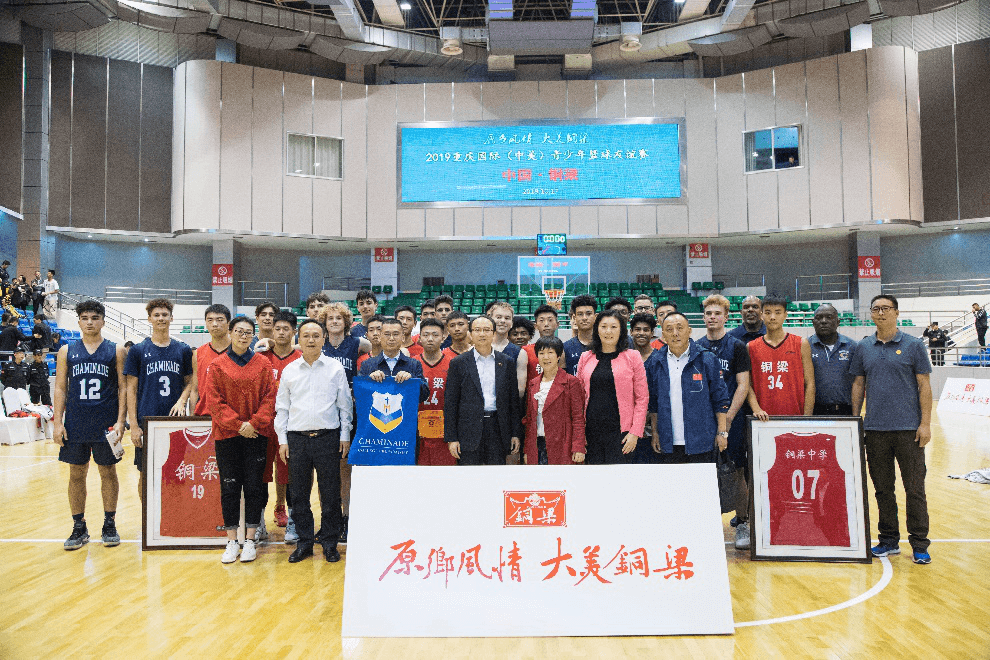 作为渝西基础教育高地,百年名校铜梁中学此次特与查米纳德高中篮球队于铜梁区金龙体育馆展开2019重庆国际(中美)青少年篮球友谊赛。铜梁区政协副主席杨大怀特为比赛开球。赛场上,中美两国青少年们拼抢激烈,带球、运球、投篮等一系列动作潇洒、规范,引来现场观众阵阵喝彩。紧张激烈、扣人心弦的角逐不断在篮球场上演。流畅的进攻、娴熟的运球、积极的防守也同时展现了中美青少年不畏艰难、拼搏进取的精神和活力。次日,为加强双方长期友好交流,查米纳德高中特与铜梁中学缔结为友好学校。